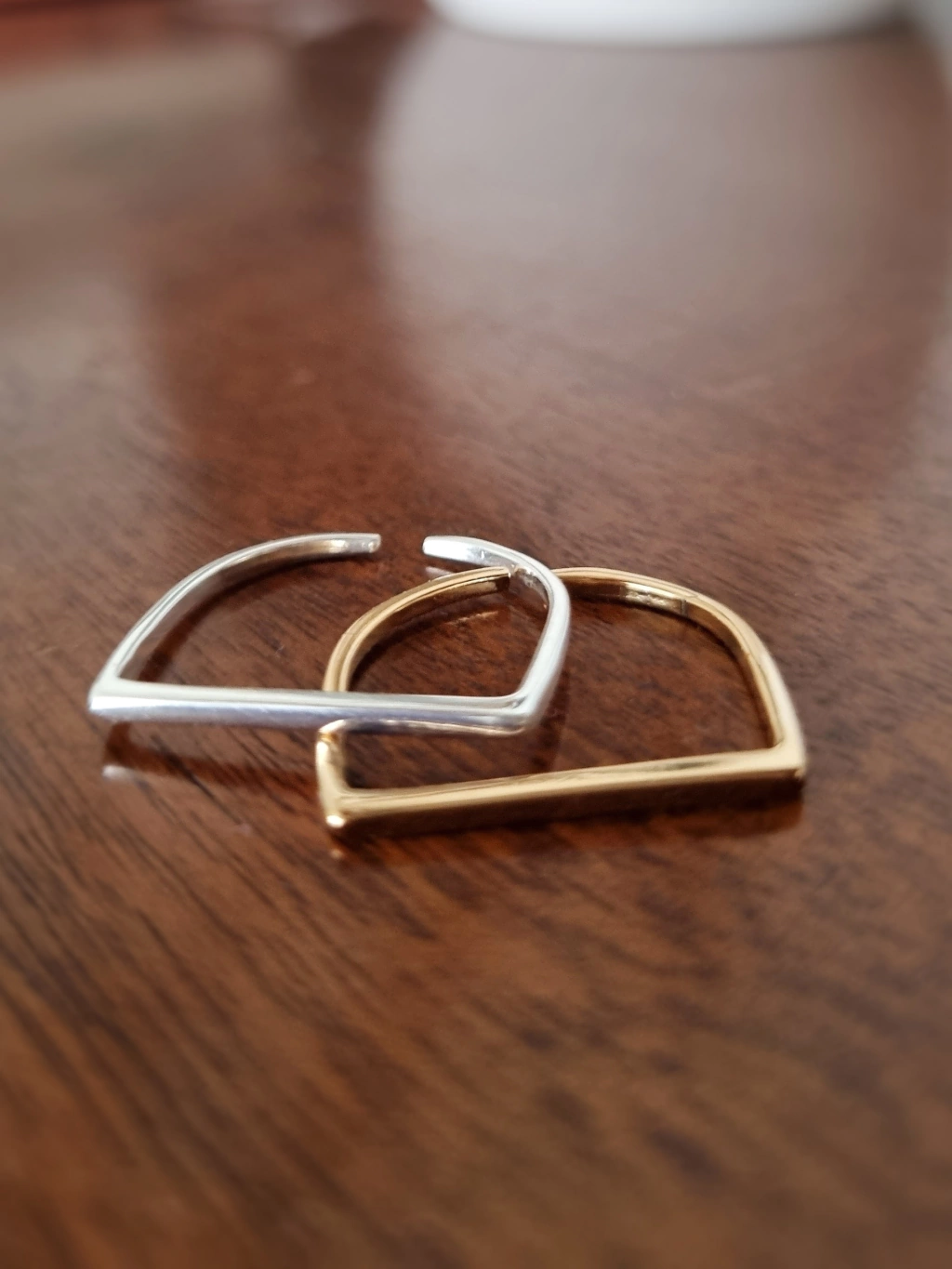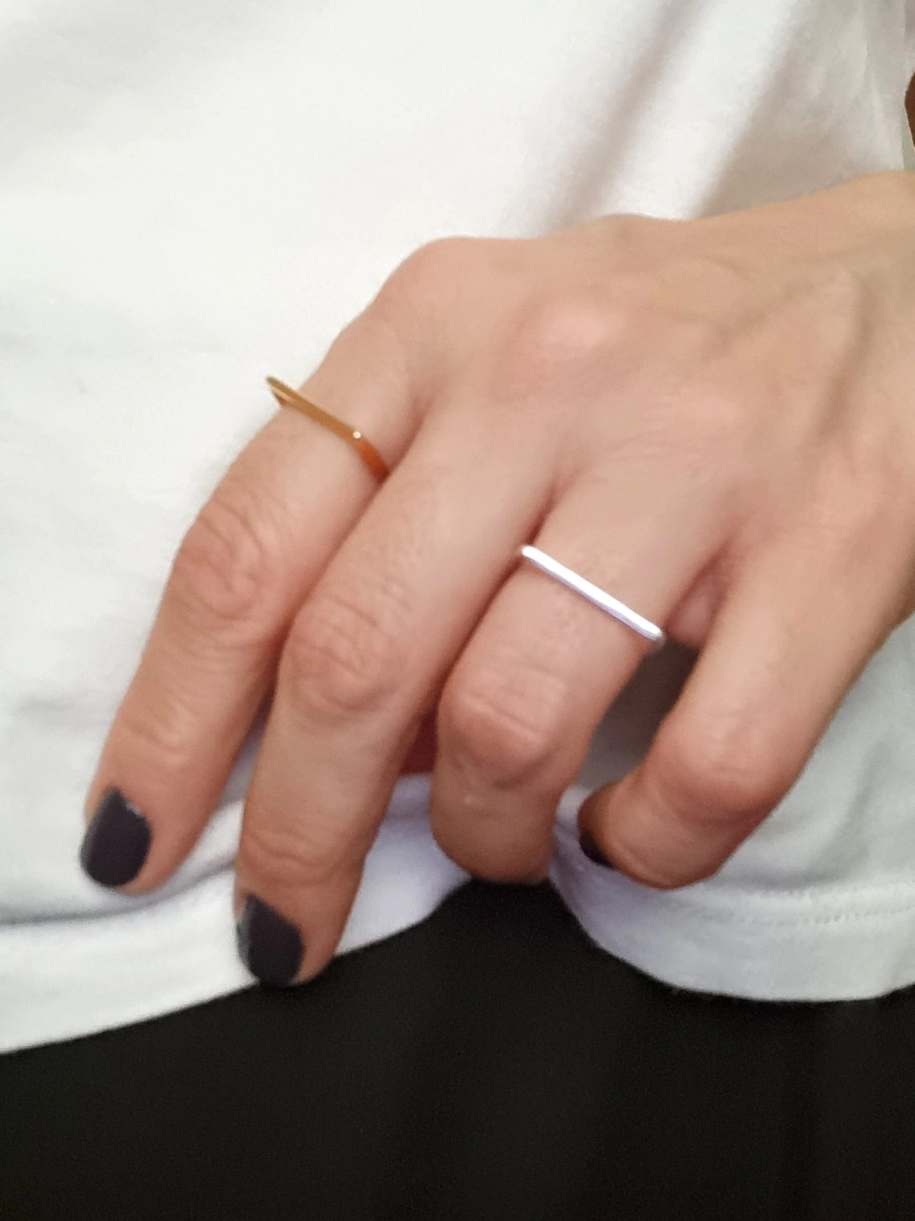 A dupla minimalista de anéis Traço mistura os banhos de ouro e prata para serem usados juntos, separados ou ainda combinados em um mix com outros anéis.